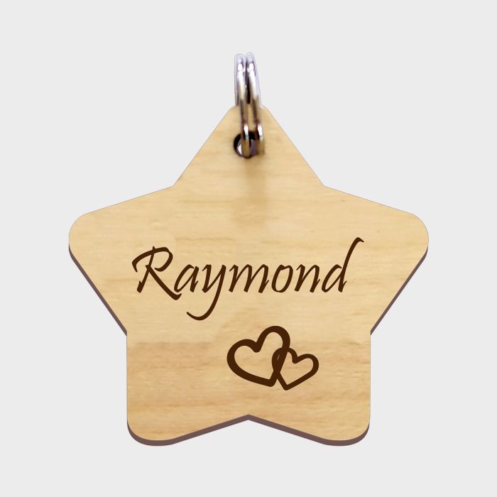 Médaille gravée en bois en forme d'étoile pour votre chien ou votre chat. Un indispensable pour votre animal de compagnie, une médaille est immédiatement visible et lisible si votre animal est retrouvé errant. Gravez-là tout simplement à son nom, ou mettez-y le texte de votre choix, ce joli modèle de médaille en forme d'étoile est prévue pour. Il sera pour vous très sécurisant de savoir votre animal de compagnie équipé de cette médaille gravée adaptable à son collier ou à son harnais, un moyen sur pour vous de le retrouver très rapidement en cas de fugue.